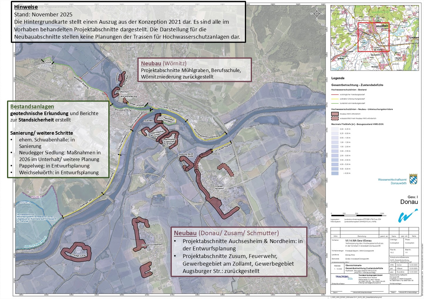 Das Vorhaben zielt darauf aus, den Hochwasserschutz der Stadt Donauwörth zu verbessern. Es sollen vorgelagerten Stadtteile durch neue Hochwasserschutzanlagen geschützt als auch bestehende Anlagen im innerstädtischen Bereich angepasst werden.